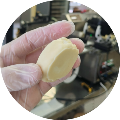 Подрезка юбки и хвостика, комбинированый режим работы де-тейлера (наше "ноу-хау"). Позволяет наилучшим образом обрабатывать юбочки и хвостики на изделиях при обливке густым шоколадом.